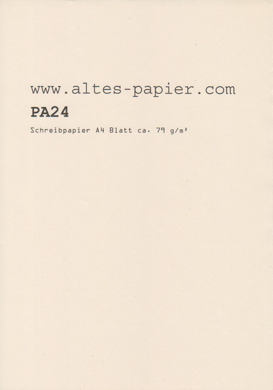 Das echte alte Papier wurde über die vielen Jahre trocken gelagert und ist dadurch ausgetrocknet. Wir haben jetzt 16 Blatt altes Schreibpapier PA24b gewogen. Demzufolge ergibt sich jetzt ein Papiergewicht von 79g/qm. Die Abmessungen des alten Schreibpapiers entsprechen dem DIN A4 Format, wobei kleinere Abweichungen durch die damalige Produktion natürlich möglich sind.
